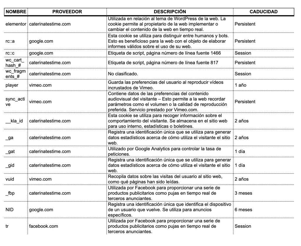 A continuación se ha elaborado un listado de las cookies propias y de terceros de tipo técnicas, de personalización, de análisis, y de marketing empleadas en NUESTRA PÁGINA WEB: